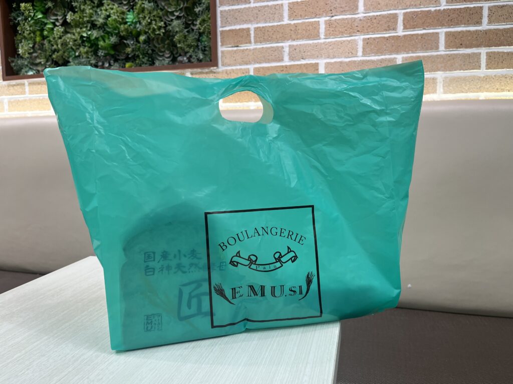 現在店舗でも使用している緑色のショッピングバッグ。パステルグリーン地にエミュウのロゴを冠した、大きめ横長サイズのバッグです。1個でもお客様がパンを購入してくださった際は、必ずそのショッピングバッグに入れていました。他店の商品をお持ちの際も、まとめて入れて差し上げる。そうすると、会場内にだんだんエミュウの緑色の袋が増えて目立つようになるんです。